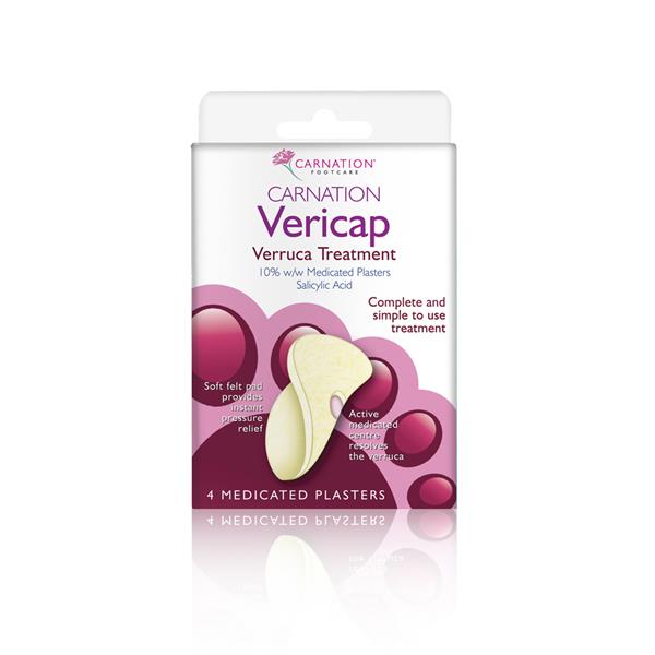 Carnation Footcare Vericaps contain a unique Salicylic Acid paste to resolve the verruca. Padding on the Vericap relieves the pressure that can cause pain.