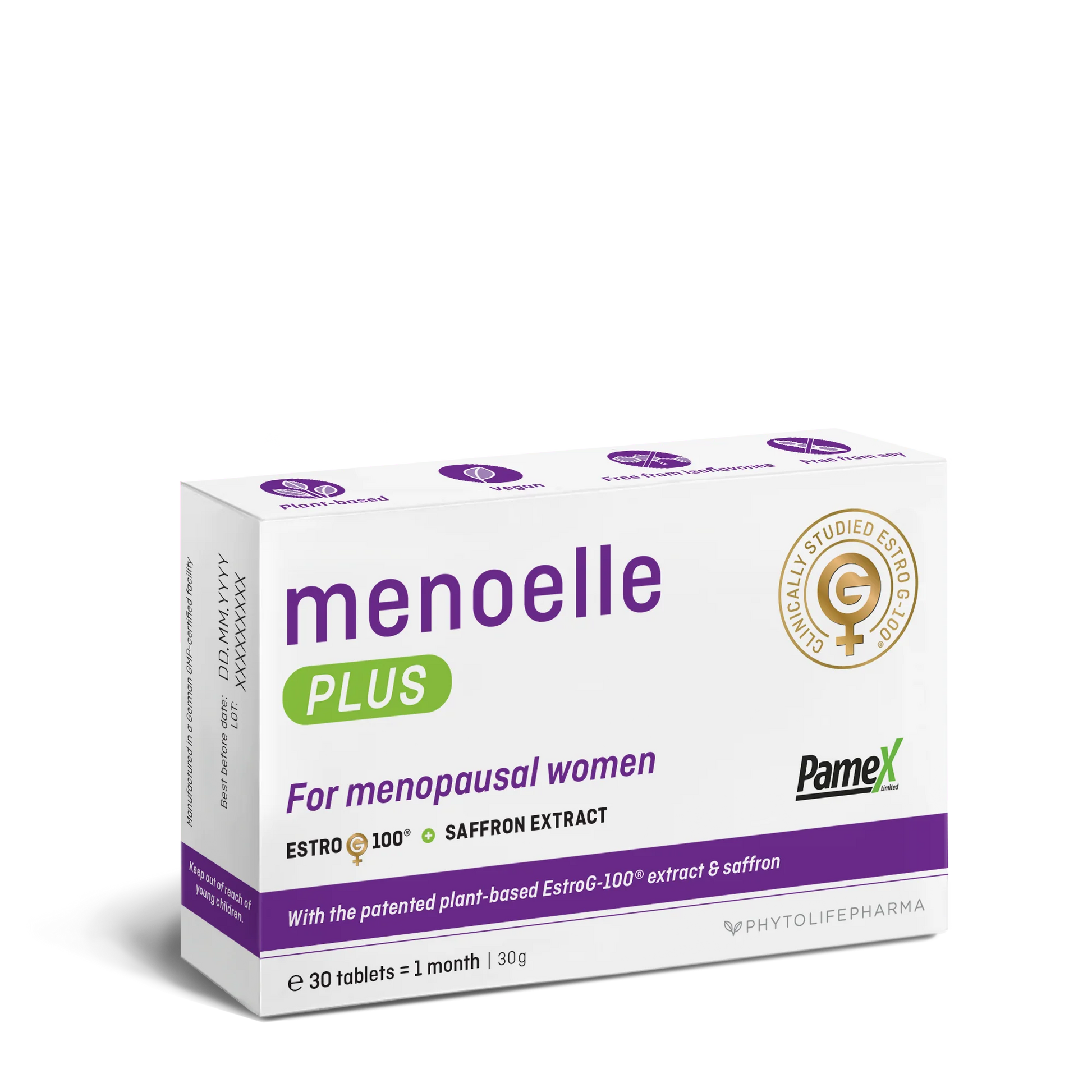 Menoelle Plus contains the patented plant-based EstroG-100 extract (which comprises Cynanchun wilfordii, Phlomis Umbrosa and Angelica Gigas root extracts) and a patented European saffron.