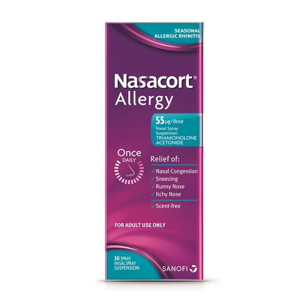 Nasacort contains a medicine called triamcinolone acetonide. This belongs to a group of medicines called corticosteroids which means it is a type of steroid. Nasal symptoms of allergy include sneezing, itching, and having a blocked, stuffy or runny nose. These can be caused by things such as: animal fur or house dust mites. This type of allergy can happen at any time of the year and is called ‘perennial allergic rhinitis’. Pollen. This type of allergy, such as hay fever, can be caused by different pollens indifferent seasons of the year. This is called ‘seasonal allergic rhinitis’. This medicine only works if used on a regular basis and may not help your symptoms straight away. It helps some people within the first day of treatment, however, for other people it may take 3 to 4 days to feel a relief.