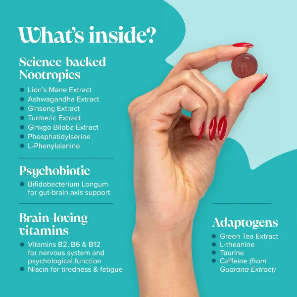 Our delicious Focus Gummies are filled with superfoods like adaptogenic mushrooms, ashwagandha, and green tea extract, as well as vitamin B12 which supports psychological function, energy metabolism, and nervous system health.
